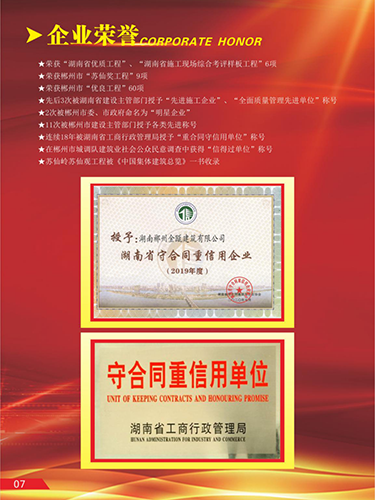 公司注册资本金6000万元,现有各类专业技术管理人员135人,其中具有高级工程师(经济师) 3人,中级职称工程师、会计师31人,一级建造师7人,贰级建造师16人,取得建筑工程岗位证的施工员、安全员,质量员等人员89人。近年来,公司认真贯彻落实国家有关建设工程法律法规,积极推行质量安全标准化管理,狠抓工程质量安全管理,秉承“对业主负责,让用户放心”的经营理念,坚持“一流的建筑质量、一流的施工安全、一流的生产效率”的公司宗旨,优良率80%以上。先后荣获省、市级“优质工程”、“施工现场综合考评样板工程”65项,郴州市“苏仙奖工程”9项,“湖南省优质工程”4项。公司先后16次被省、市建设主管部门授予“先进施工企业”称号,2次被郴州市委、市政府命名为“明星企业”,连续9年被省工商行政管理部门授予省级“重合同守信用单位”称号,被市金融部门评定为“AA级信用等级单位”。在郴州市城调队建筑业社会公众民意调查中获“信得过单位”称号。公司信誉和工程质量得到了社会各界的广泛认同和肯定。