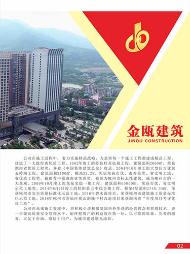 湖南郴州金瓯建筑有限公司简介本公司系原永兴县油市建筑工程公司改制重组而设立。于1998年实现资质升级,取得省住房和城乡建设厅颁发的建筑工程施工总承包贰级资质,建筑装修装饰工程专业承包贰级、防水防腐保温工程贰级、建筑幕墙工程贰级、消防设施工程施工贰级、市政公用工程施工总承包叁级、古建筑工程专业承包叁级、地基与基础工程专业承包叁级、钢结构工程专业承包叁级、水利水电工程施工总承包叁级、城市及道路照明工程专业承包叁级、环保工程叁级及施工劳务企业资质等十三项专业施工资质。